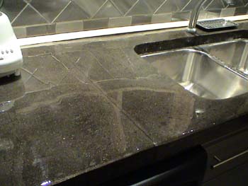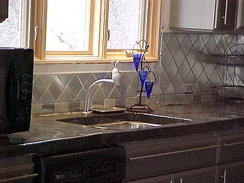 We still want a quarter round or something, to go between the backsplash and the counter. We're thinking cobalt blue. Notice how reflective the counters are. At night all sorts of interesting light patterns are reflected on the ceiling. |