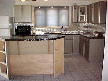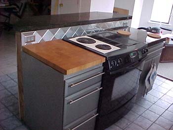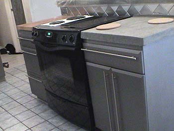 The counter tops are sealed. The contrast is great, and we love the texture. The epoxy wasn't too bad to work with. Now we just have to see how it holds up... Feb 2003 |