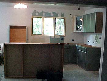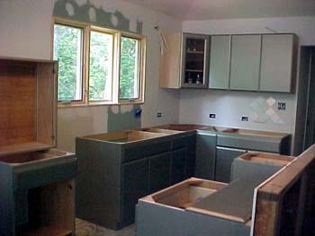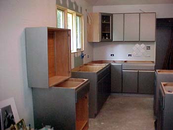 ![]() The new cabinets are in. We had a local cabinet maker make the boxes and bought the Thomasville doors from Home Depot. Here I've just started painting with primer. May 2002 |