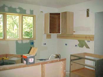 ![]() Getting started hanging the uppers. Almost put in the lowers first, but I had a hard time reaching to put the screws in in the uppers, so we did it this way. The board below helped a lot with supporting and levelling. June 2002 |